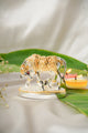 A gold and silver plated Kamdhenu cow idol, often depicted with her calf Nandini, is a sacred symbol in Hinduism representing abundance, prosperity, and fulfillment of wishes. These idols are typically crafted from materials like brass or polyresin and then plated with 24-carat gold and 999 silver, giving them an elegant and luxurious appearance. They are often used in homes and temples for worship, vastu correction, and as decorative items.